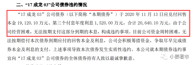 11月13日,成龍建設(shè)集團有限公司(以下簡稱“成龍集團”)公告稱,“17成龍03”于2020年11月13日應(yīng)兌付回售本金19120.1萬元、第三個付息年度利息1520萬元,合計20640.1萬元。由于公司經(jīng)營困難,無法按期支付這部分到期的本息,構(gòu)成違約事項。