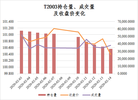 在2月3日股市暴跌,T暴漲之后,國債期貨便出現(xiàn)成交量縮減情況,整體持倉量也伴隨橫盤波動,部分大佬獲利了解,以及移倉T2006影響,出現(xiàn)萎縮。回顧T收盤價走勢,可窺見其與大盤指數(shù)相異,并未呈現(xiàn)單一走勢。