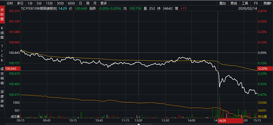 2月14日,國債期貨的閃崩其實還挺讓人搞不懂的。上午受股市連續(xù)多日向好影響(大家已經(jīng)對股市回調(diào)放棄幻想了),T開盤后略有下行,但幅度不大,整體1-2毛左右波動。午后,T略有拉升,但還是低于開盤價,整體交易量也不大。與之相對,大A股午后也略有回落,但仍飄紅。