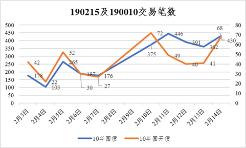 說好的1個BP玩一天呢,咋突然開起過山車了~通過交易筆數(shù),我們可窺見在2月10日之后,215的交易量與節(jié)前大致持平。但其利率水平,除卻2月10日收在3.20,其他交易日基本都以3.25-3.26居多。