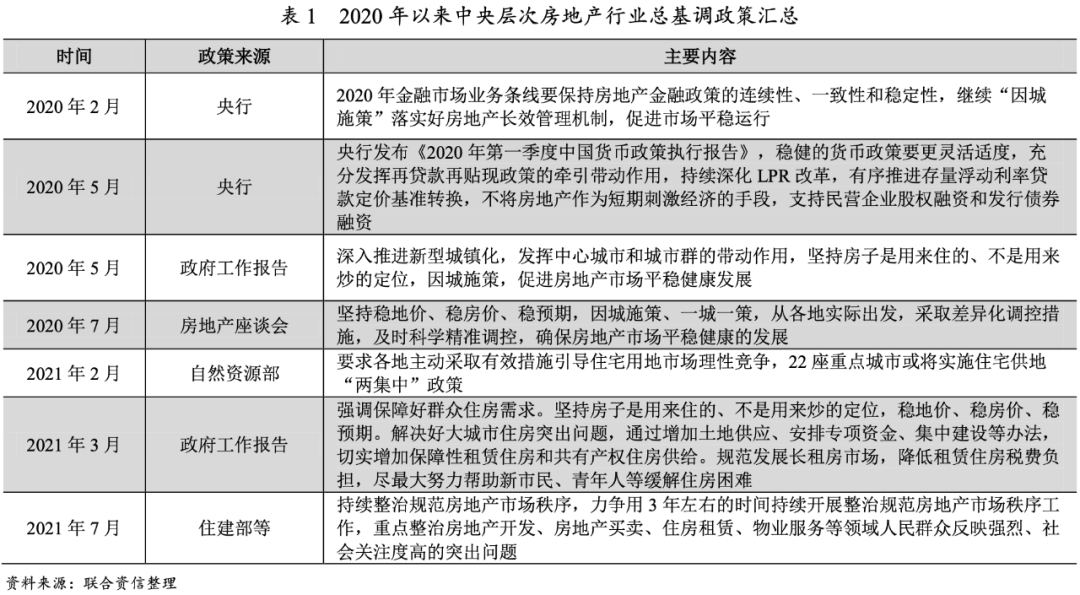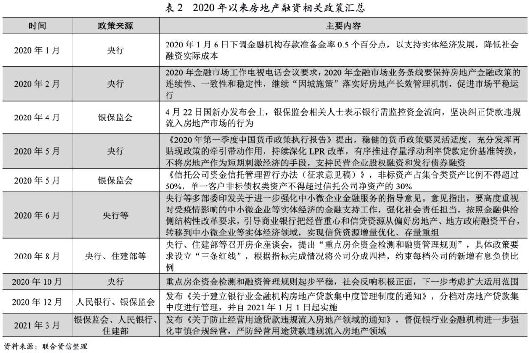 2020年8月20日,住建部和人民銀行在北京召開重點房地產企業座談會,研究進一步落實房地產長效機制并提出資金檢測和融資管理規則(簡稱“三道紅線”)。2020年12月,央行聯合銀保監會發布《關于建立銀行業金融機構房地產貸款集中度管理制度的通知》,劃定銀行房地產貸款集中度“紅線”,明確對5檔機構分類分檔設置明確的房地產貸款占比上限、個人住房貸款占比上限。2021年2月24日,青島市自然資源和規劃局發布《堅決落實上級有關要求,部署2021年住宅用地供應工作》,提到嚴格實行住宅用地“兩集中”同步公開出讓,即集中發布出讓公告、集中組織出讓活動。隨后,國家自然資源局向全國22個重點城市下發通知,要求住宅用地出讓工作“兩集中”,不超過3次集中發布公告和組織出讓活動。