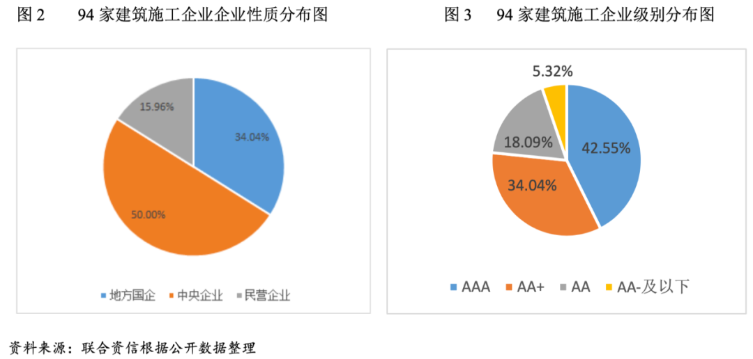 按級別分布看,建筑施工企業以AAA和AA+為主,其中AAA企業40家,AA+企業32家,AA企業17家,AA—企業2家,A+、A—和BB企業各1家。