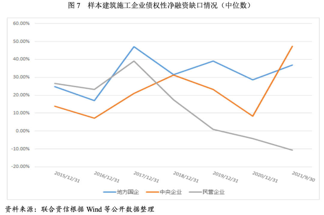 房地產行業政策調控導致房地產企業資金壓力逐步加大,房地產企業或主動、或被動降杠桿。盡管房地產企業通過加快開工、加大銷售以回籠資金,但在各地購房政策持續趨嚴、貸款集中度管理制度出臺后限制房貸投放額度的背景下,房地產銷售與融資在嚴監管政策延續的背景下預計將持續受限,房地產企業開發資金規模將呈現下滑趨勢。進入2021年,伴隨著民營房地產企業票據違約事件頻發,陸續有民營房地產企業債券違約、九月以來部分房地產企業的簽約銷售金額大幅下滑等負面事件疊加,民營房地產企業的融資環境更加緊張,并繼續向其上游建筑施工企業傳導。我們以“(取得借款收到的現金+發行債券收到的現金-償還債務支付的現金)/償還債務支付的現金”(中位數)指標[1],來衡量樣本企業2015-2020年及2021年1-9月的債權性凈融資缺口。