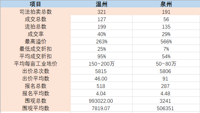 2017年淘寶數(shù)據(jù)中工業(yè)資產(chǎn)已結(jié)束的司法上拍記錄中泉州191個,溫州321個,剔除流拍/撤回/中止等因素抽取成交數(shù)據(jù)做參考。如上表所示:泉州整體上拍賣總量比溫州低41%,成交折扣低41%,成交率低11%,溫州平均每畝工業(yè)用地均價高出泉州近一倍。不論是工業(yè)成交價,平均溢價率,競爭程度,平均工業(yè)用地價格等方面兩地相距甚遠(yuǎn),筆者特意收集了報名人數(shù)/出價次數(shù)/圍觀人數(shù)這3組數(shù)據(jù),發(fā)現(xiàn)幾乎溫州溢價在120%以上的工業(yè)拍品都會有至少3人以上哄搶的場景,完全可以用“網(wǎng)紅”來形容溫州的工業(yè)二級市場。