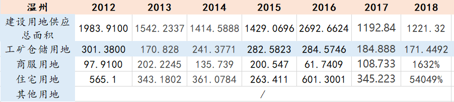表4(2012年-2018年溫州建設(shè)用地一級市場供應(yīng)數(shù)據(jù)明細(xì))數(shù)據(jù)來源:溫州市國土資源局/中國自然資源部/溫州市統(tǒng)計局(單位:公頃)