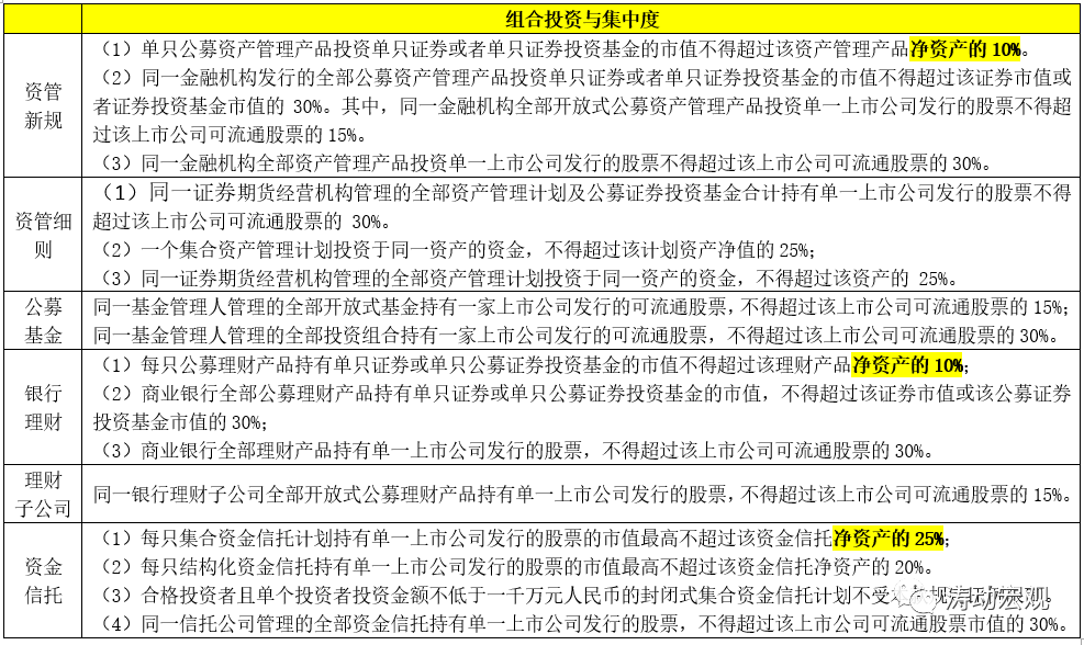 集中度約束主要體現在:(1)不得超過資產管理產品凈資產的一定比例(資管新規和理財新規為10%、結構化資金信托為20%、集合資金信托計劃為25%);(2)不得超過可流通股票或證券市值的一定比例(主要有15%和30%兩個比例)。進一步來看,資金信托的監管最為寬松,理財子公司次之。