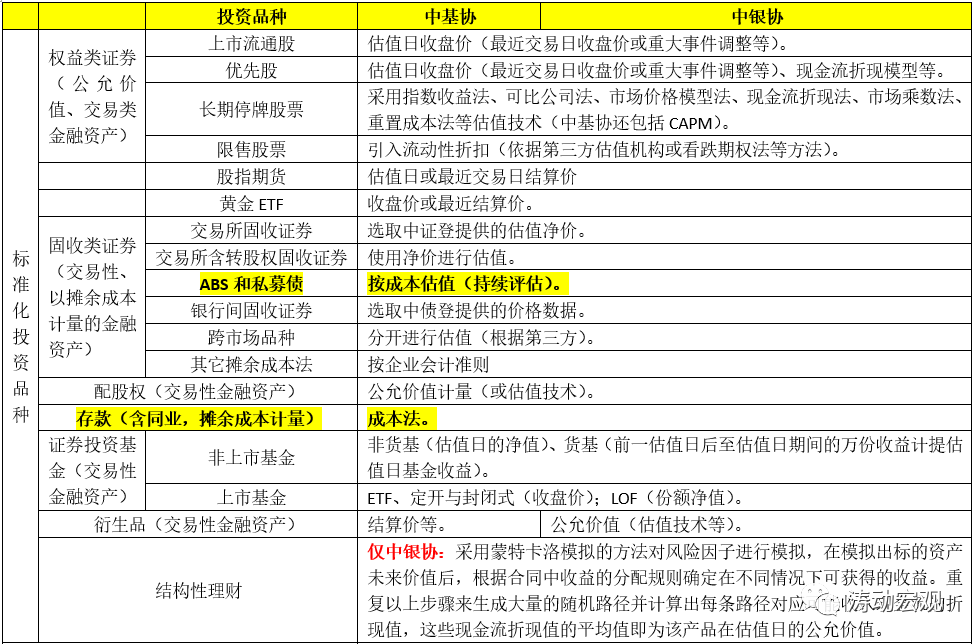 4、對非上市股權,中基協和中銀協的估值方法也比較一致,均采用市場法(參考最近融資價格法、市場乘數法、行業指標法);收益法(現金流折現法和股利折現法);成本法(凈資產法)等常用的估值方法。