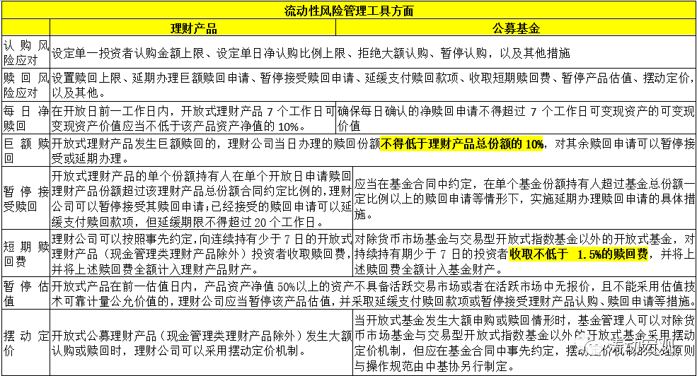 2、在贖回風險應對方面,工具主要包括延期辦理巨額贖回申請、暫停接受贖回申請、延緩支付贖回款項、收取短期贖回費、暫停產品估值、擺動定價等。此外,理財產品的贖回風險應對方面還包括設置贖回上限。