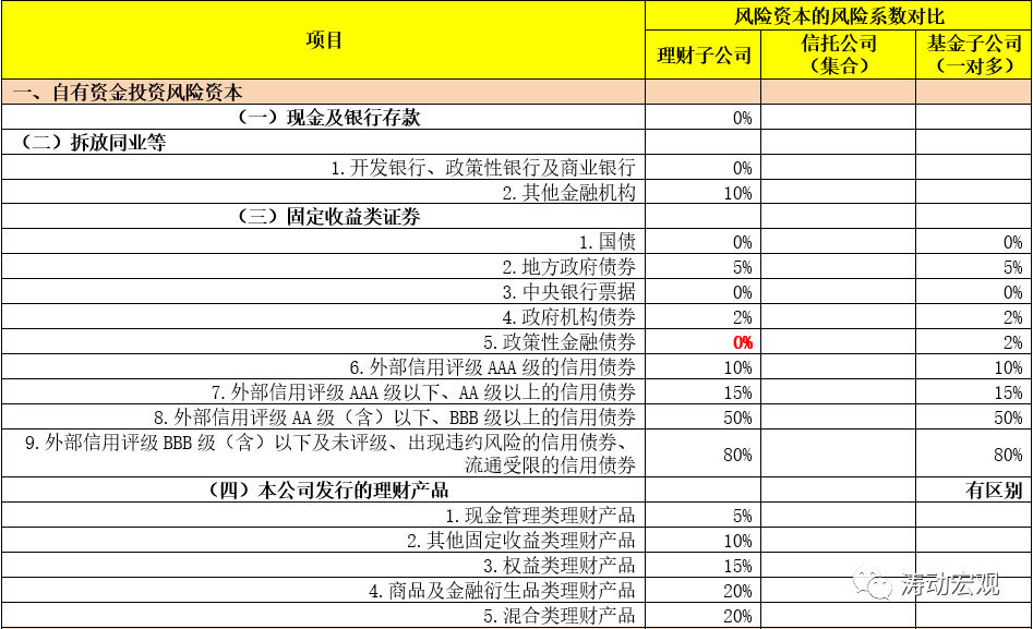 當然,二者也有不同,如自有資金投資政策性金融債的風險系數(理財子公司與基金子公司分別為0%和2%)、自有資金投資本公司發行的理財產品(理財子公司針對不同理財產品設定了具體的風險系數)、針對未上市企業股權的風險系數(理財子公司與基金子公司分別為1.50%和0.60%)等等。