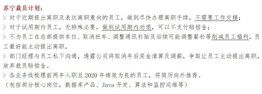 據說,蘇寧自從大年初八的開工大會,傳達了“該關的關,該砍的砍”這個思想,就制定了裁員計劃,而且要在2021年4月底前完成第二季度裁員指標。