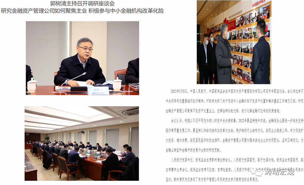 2022年2月10日,金融管理部門刊發一則新聞“2022年2月8日,郭主席主持召開調研座談會研究金融資產管理公司如何聚焦主業 積極參與中小金融機構改革化險”。從發布的新聞稿來看,該座談會的參會嘉賓包括郭主席、潘功勝副行長、曹宇副主席、銀保監會首席風險官和首席檢查官以及5家金融AMC(即信達、長城、東方、華融與銀河)(關于金融AMC的分析參見金融AMC、金融AIC與地方AMC手冊(2021年版)),其中有兩個表述值得關注: