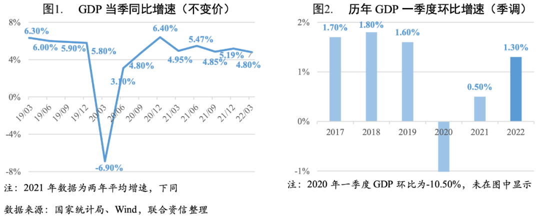 2022年一季度,國際形勢更趨復雜嚴峻,國內疫情呈現點多、面廣、頻發的特點,對經濟運行的沖擊較大。經初步核算,一季度國內生產總值27.02萬億元,不變價同比增長4.80%,較2021年四季度兩年平均增速[1](5.19%)有所回落;環比增長1.30%,雖高于2021年但不及疫情前水平。3月消費、汽車產銷以及房地產鏈條等相關指標增長放緩,基建投資、財政提前發力對經濟形成一定的支撐。