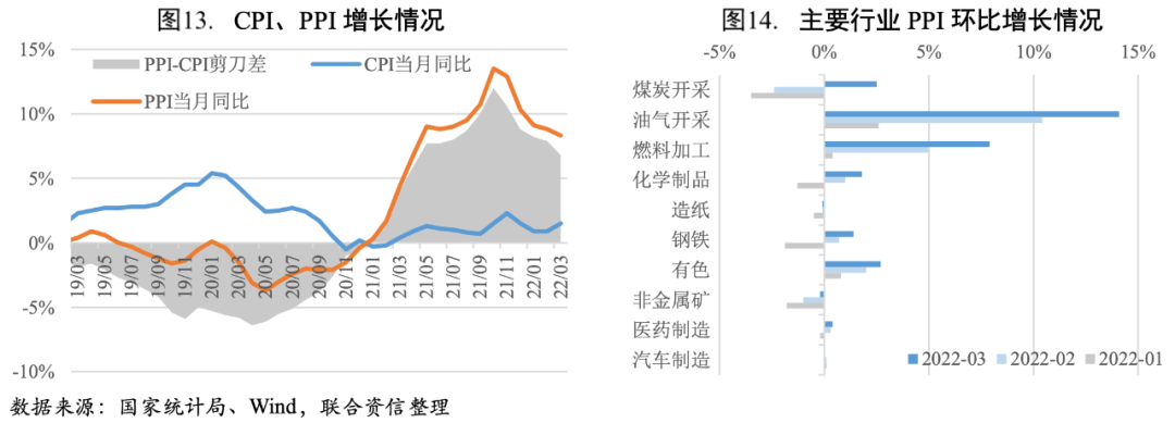 一季度PPI-CPI剪刀差繼續收窄,但PPI回落節奏有所放緩,中下游企業的成本壓力仍然較大,盈利情況改善預期轉弱。向前看,俄烏地緣政治沖突對原油、天然氣、有色金屬、化肥以及糧食等重要大宗商品的供應造成沖擊,供應鏈受阻、運輸和交易成本上升,國際大宗商品大概率繼續在高位波動,我國輸入型通脹壓力仍存。
