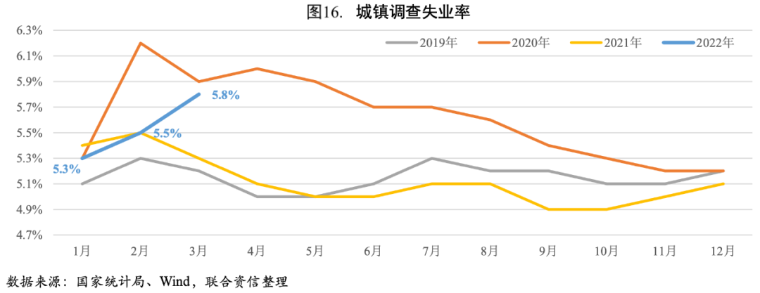 一季度我國城鎮調查失業率均值為5.50%,同比上升0.10個百分點。其中,1-2月就業情況總體穩定,全國城鎮調查失業率接近上年同期水平,環比小幅上升主要是春節假期的影響,符合季節性變化規律;而3月以來國內局部疫情加重,交通運輸、住宿餐飲、批發零售、文化旅游等服務行業受影響較大,用工需求減弱,城鎮調查失業率上升至5.80%,較上年同期上升0.50個百分點,穩就業壓力有所增大。