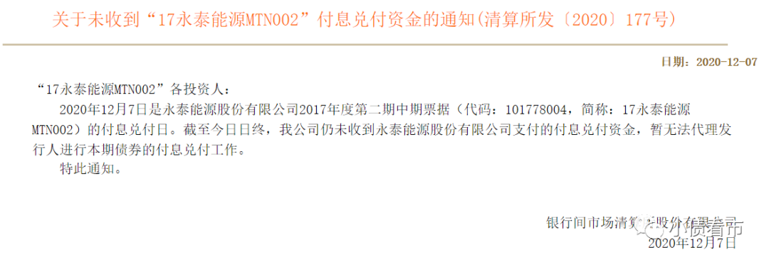 12月7日,上清所公告稱,未收到永泰能源(600157.SH)2017年度第二期中期票據(17永泰能源MTN002)付息兌付資金,暫無法代理發行人進行本期債券的付息兌付工作。