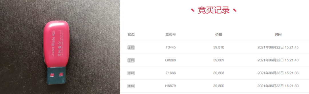 但6月21日結束時,該U盤的競買價格已升至1512元。而截至6月22日15時21分45秒,即拍賣中止前,該U盤的拍賣價格更是高達39810元,共有1186次競買,總計吸引了超29萬次圍觀。