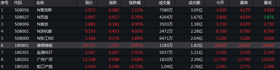 9只首批上市的公募REITs,全部收漲,成交量也較活躍,其中蛇口產園日內成交量超1億。