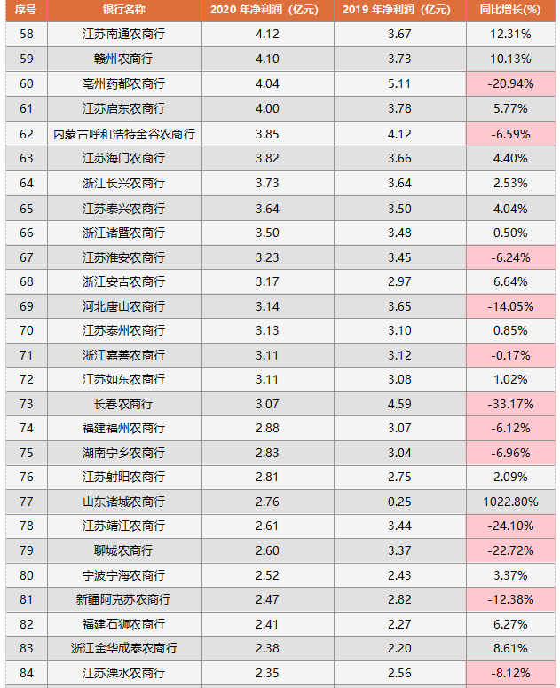 浙江溫州鹿城農商行、江蘇蘇州農商行、浙江杭州余杭農商行等100家農商行,凈利潤為1-10億之間,其中有59家呈現同比負增長,其中河北正定農商行降幅最大,達到-78.18%。
