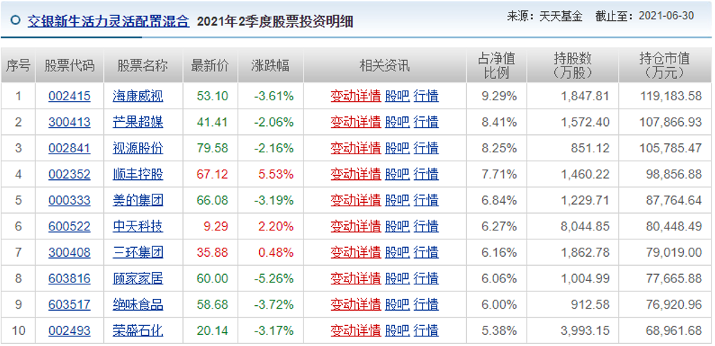 “交銀新生活力”以傳媒、物流、家電為主,然而第二季度國內投資和消費數據低于預期,互聯網平臺、教育等行業被整頓,在這種背景下,傳統消費板塊、家電等傳統白馬股走勢較弱,這也是其基金表現落后的原因之一。