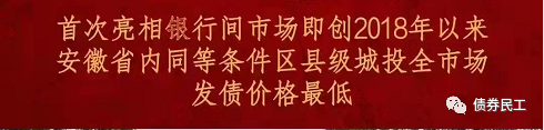 1、海報中連著用了6個定語來界定利率最低,強調(diào)首次發(fā)行+特定市場+特定時間+特定區(qū)域+特定條件+特定行政級別最低發(fā)行利率的海報,即首次亮相銀行間市場即創(chuàng)造了2018年以來安徽省內(nèi)同等條件區(qū)縣級城投最低發(fā)行利率。