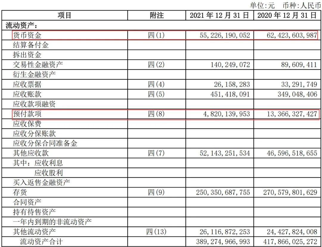 年報顯示,2021年新城控股流動資產(chǎn)中變動較大的是貨幣資金和預(yù)付款項。其中貨幣資金同比減少約72億元,為552.3億元。