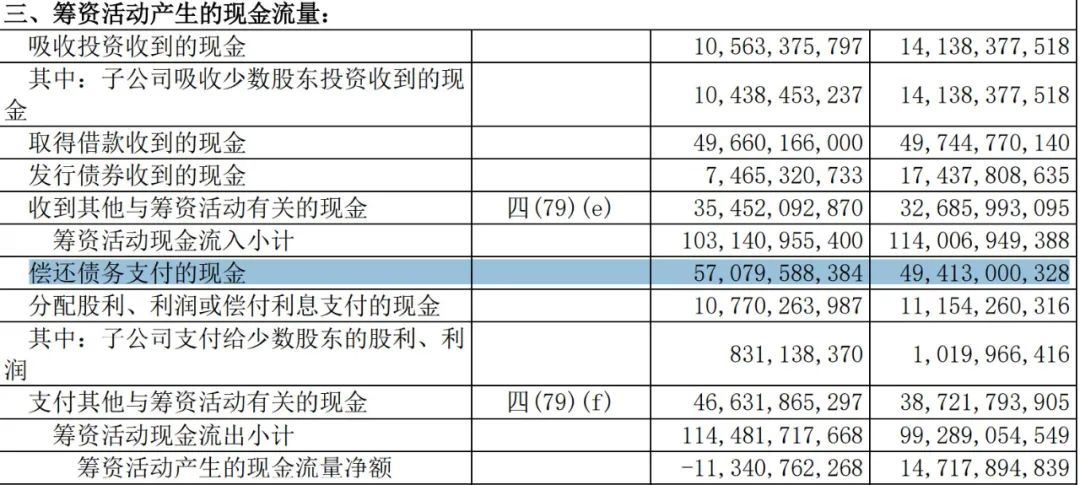 如下圖年報顯示,主要是償還債務(wù)支付的現(xiàn)金增加了76.7億到570.8億元;發(fā)行債券收到的現(xiàn)金減少了100億左右,為74.65億元;支付其他與籌資活動有關(guān)的現(xiàn)金466.3億元,比2020年增加了79億左右,主要包括支付少數(shù)股東往來款、償還關(guān)聯(lián)方計息資金往來、回購庫存股等。