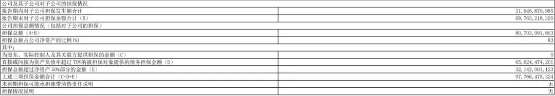 擔(dān)保方面,新城控股報告期內(nèi)對子公司擔(dān)保發(fā)生額合計為319.5億元,直接或間接為資產(chǎn)負債率超過70%的被擔(dān)保對象提供的債務(wù)擔(dān)保金額為656.2億元,擔(dān)保總額超過凈資產(chǎn)50%部分的金額為321.42億元,擔(dān)保總額807.03億元,擔(dān)保總額占公司凈資產(chǎn)的比例為83%。