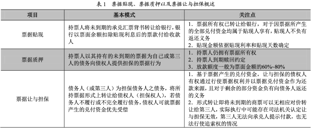 在我國實體經(jīng)濟發(fā)展過程中,對于中小企業(yè)來說,以票據(jù)貼現(xiàn)方式進行融資手續(xù)簡單且融資成本較低,應(yīng)用較為普遍。在此基礎(chǔ)上,為免疑義,在進入主要話題前,以下概念需要先進行區(qū)分:票據(jù)讓與擔保、票據(jù)貼現(xiàn)以及票據(jù)質(zhì)押(具體內(nèi)容詳見下表)。