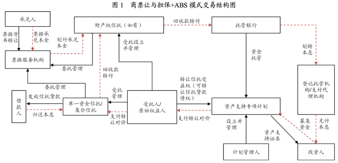 附有商票讓與擔保的債權(quán)類ABS一般是以底層資產(chǎn)涉及的商票承兌人付款為最終還款來源,基礎(chǔ)資產(chǎn)為單一資金信托/集合資金信托的信托貸款債權(quán)或形成財產(chǎn)權(quán)信托的信托受益權(quán)。