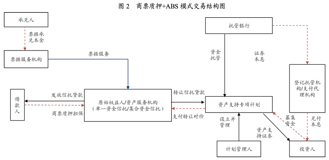 以信托貸款債權(quán)入池為例,具體而言,信托公司作為受托人設(shè)立單一資金信托/集合資金信托,將所持有的信托貸款債權(quán)及其附屬擔保權(quán)益轉(zhuǎn)讓給資產(chǎn)支持專項計劃。單一資金信托/集合資金信托資金投向均為向借款人投放的信托貸款。借款人與信托公司和票據(jù)服務(wù)機構(gòu)簽訂質(zhì)押合同及相關(guān)商票服務(wù)協(xié)議,以其基于真實基礎(chǔ)交易而合法持有的商票向信托公司(代表單一資金信托/集合資金信托)提供質(zhì)押,并由票據(jù)服務(wù)機構(gòu)作為質(zhì)押票據(jù)的代理質(zhì)權(quán)人行使質(zhì)權(quán)對應(yīng)的相應(yīng)權(quán)利和履行義務(wù)。