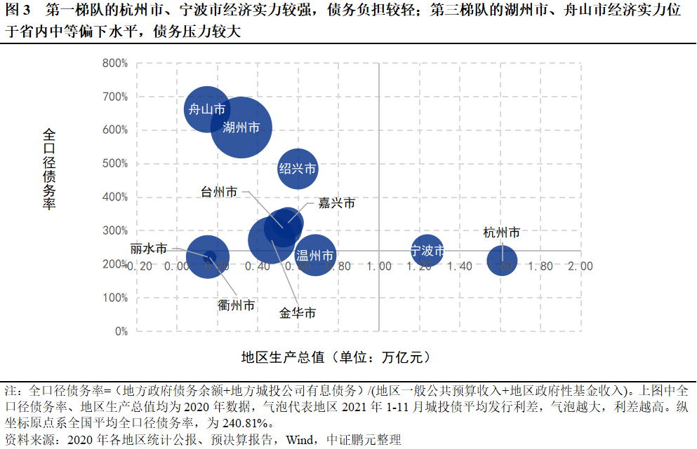 從地區經濟財政角度來看,第一梯隊的杭州市、寧波市、嘉興市、衢州市中,除衢州市外,其余地市經濟總量位居省內前列,寧波市、杭州市、衢州市全口徑債務率相對較低,嘉興市債務負擔偏重;第二梯隊的臺州市、紹興市、溫州市經濟總量位于省內中等偏上水平,但全口徑債務率表現不一,紹興市債務率偏高;第三梯隊的舟山市、麗水市、湖州市、金華市經濟實力位于省內中等偏下水平,舟山市、湖州市全口徑債務率較高,債務壓力較大,麗水市、金華市債務負擔一般。
