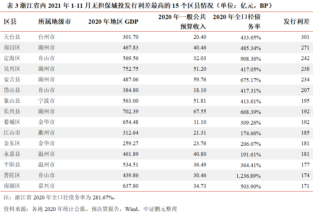 下文列示了2021年1-11月浙江省內無擔保城投發行利差最高的15個區縣情況,這些區縣主要位于湖州市、舟山市、金華市、溫州市等地,地區GDP多在600億元以下,一般公共預算收入在40億元左右及以下區間的地區較多,且全口徑債務率普遍較高,舟山市的定海區、普陀區債務率畸高。