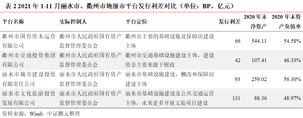衢州市經濟實力在浙江省內排名靠后,但地區城投債發行利差處于省內較低水平。究其原因,目前衢州市發債平臺較集中,主要為地級市平臺衢州市國有資本運營有限公司(以下簡稱“衢州國資”)、衢州市交通投資集團有限公司(以下簡稱“衢州交投”),2021年衢州市無擔保城投債發行規模中80%以上均由這兩家平臺所貢獻,衢州國資和衢州交投股東均為衢州市國資委,屬于衢州市內核心平臺,資本實力較強,發行利差維持在較低水平,拉低區域內整體發行利差。