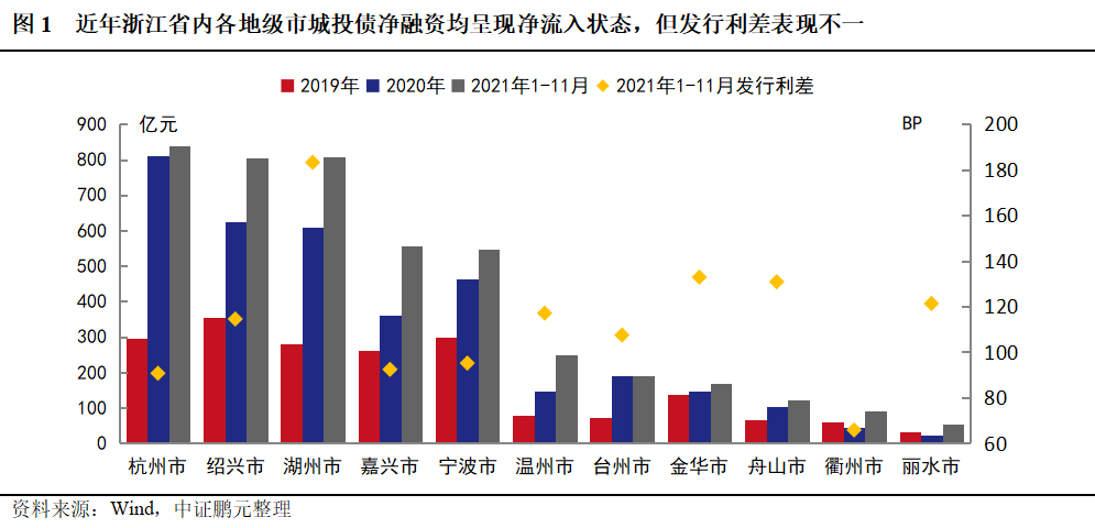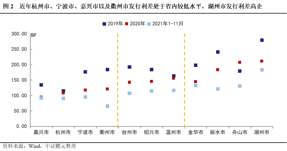 根據近年浙江省內城投發行利差情況,可將省內各地級市劃分為3個梯隊,第一梯隊包括杭州市、寧波市、嘉興市、衢州市,各地級市的2019-2020年及2021年1-11月發行利差加權平均值在100-130BP;第二梯隊包括臺州市、紹興市和溫州市,各地級市的近年發行利差加權平均值在145-150BP;第三梯隊包括金華市、麗水市、舟山市和湖州市,各地級市的近年發行利差加權平均值在160BP以上,其中湖州市受債務率高等因素影響,發行利差顯著高于其他地級市,2019-2020年及2021年1-11月湖州市城投平均發行利差為225BP。