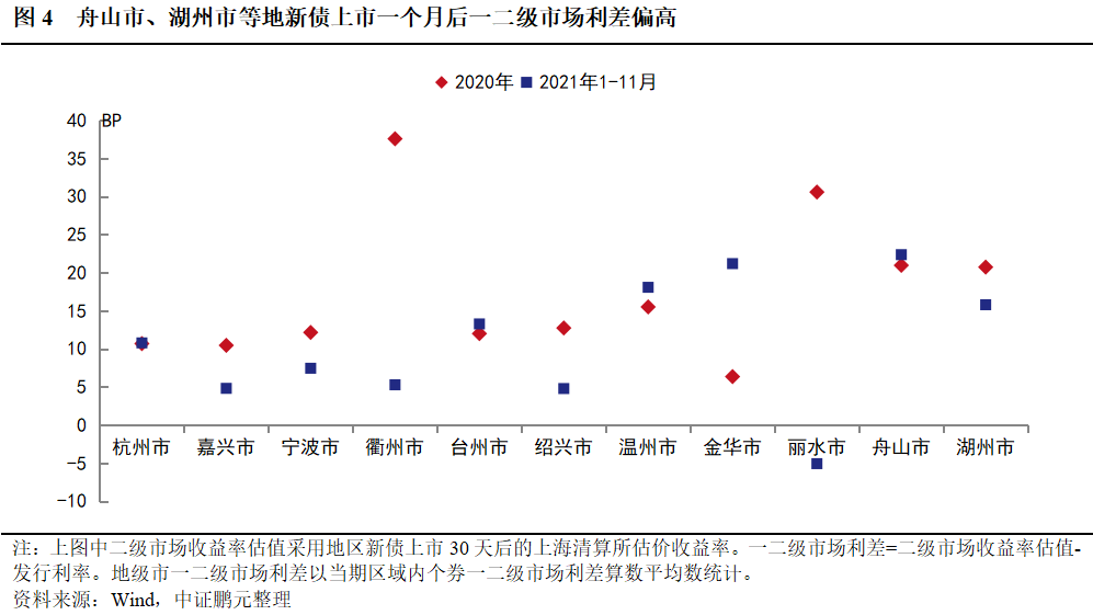 (3)新債上市一個月后,浙江省內各地級市城投債二級市場收益率估值基本高于發行利率。舟山市、湖州市等地二級市場收益率估值較發行利率的偏離度相對較高,二級市場投資者要求回報提高。