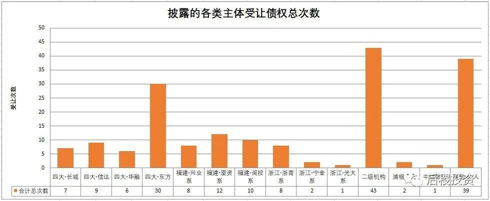 在我們搜集到的公開轉(zhuǎn)讓記錄中,未透露債權(quán)金額的共有36筆。其中大部分對成交情況判斷影響不大,但有關(guān)信達(dá)的成交記錄絕大部分均未透露債權(quán)金額,信達(dá)出讓的10次記錄全部未透露金額,而受讓的9次記錄也未透露,這造成了本文中信達(dá)債權(quán)成交額信息缺失,對總量和信達(dá)本身的情況判斷變得困難,在此提醒讀者注意。