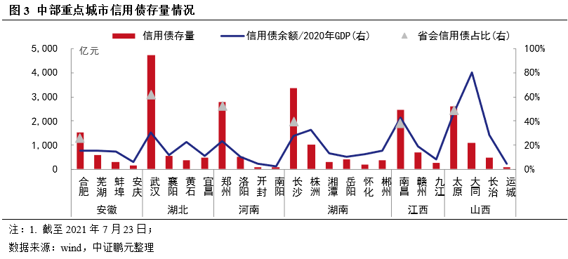 根據(jù)國家住建部編制的《全國城鎮(zhèn)體系規(guī)劃》中規(guī)劃的國家中心城市和全國區(qū)域中心城市,中部六省共占有25個(含國家中心城市2個)。截至2021年7月23日,25個中心城市信用債存量余額2.56萬億元,占中部地區(qū)信用債存量的65%。其中,省會城市用債存量余額1.75萬億元,占中部地區(qū)信用債存量的44%,略高于全國平均省會城市(不含直轄市)占比41%,但與江浙兩地的29%相比,中部地區(qū)信用債融資較為集中于省會城市。尤其是,湖北和河南兩省,省會城市信用債存量規(guī)模均超過50%,“增強(qiáng)城鄉(xiāng)區(qū)域發(fā)展協(xié)調(diào)性”需要加大中部地區(qū)非省會重點城市的融資支持力度。