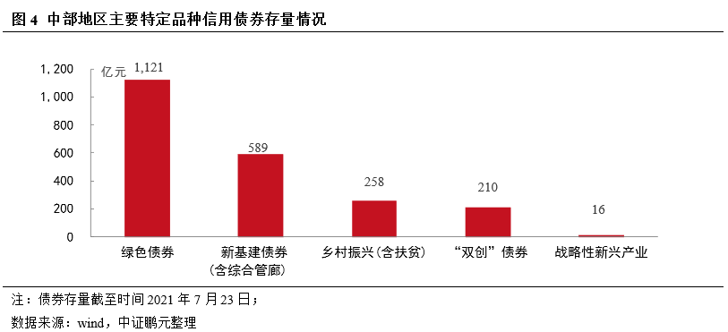 根據(jù)《意見》,綠色債券、鄉(xiāng)村振新債券(含扶貧)、“雙創(chuàng)”債券、戰(zhàn)略性新興產(chǎn)業(yè)專項債券、新型基建領(lǐng)域?qū)m梻忍囟ㄆ贩N債券可成為中部地區(qū)高質(zhì)量發(fā)展的推手。上述特定品種信用債券,中部地區(qū)的存量余額為2,193.59億元,占全國總余額的16%,略低于區(qū)域全部信用債18%的占比,仍有較大提升潛力。綠色債券、新基建(含綜合管廊)專項債是現(xiàn)階段主要的特定品種債券,其中綠色債券存量余額1,120.90億元,遠(yuǎn)高于其他特定品種債券種類?!兑庖姟分卸啻翁岬健熬G色”相關(guān)概念,堅持綠色發(fā)展和實現(xiàn)碳中和也是我國長期國策。在政策支持和鼓勵下,中部地區(qū)利用創(chuàng)新債券品種的水平將進(jìn)一步提升。