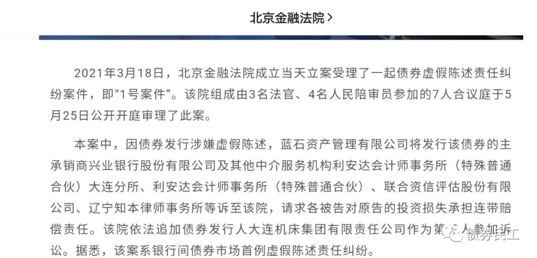 根據(jù)北京金融法院公開披露的信息,2021年5月25日法院正式開庭審理“1 號(hào)案”,大連機(jī)床債券虛假陳述責(zé)任糾紛案件系銀行間債券市場(chǎng)首例虛假陳述責(zé)任糾紛。