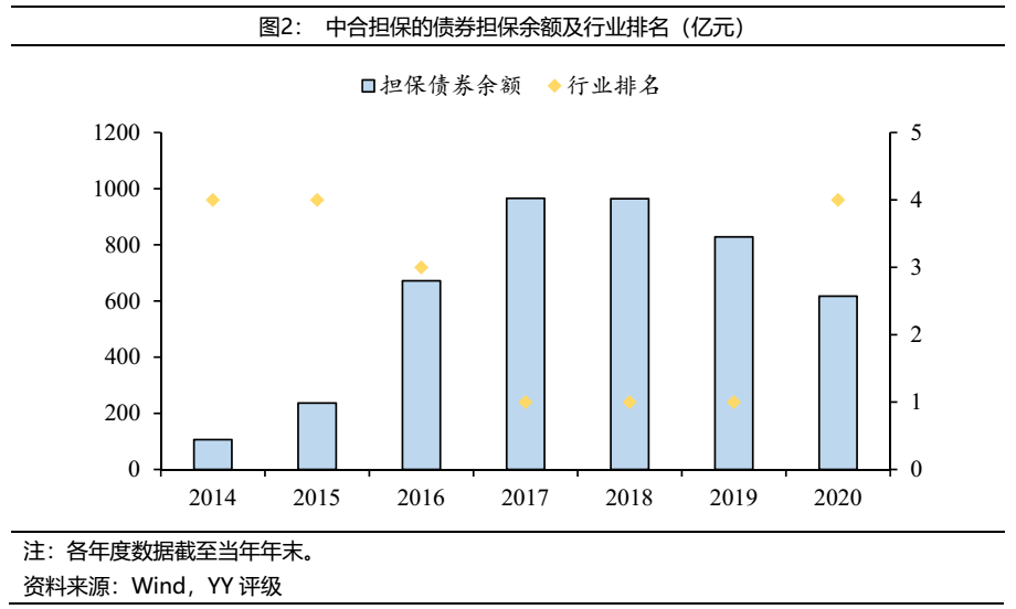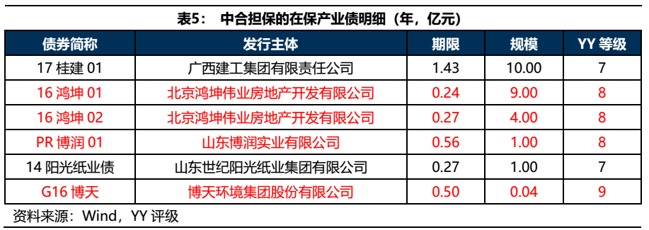 中合擔保在保產業債整體資質較差,公司今年有一定的代償壓力。截至2021年4月,中合擔保在保的產業債余額共25.04億元,其中15.04億將在今年到期。從主體資質上看,博天環境YY等級為9,鴻坤偉業、博潤實業YY等級為8,陽光紙業YY等級為7,違約風險較高,且這幾只產業債均在今年到期,預計屆時公司會有一定的代償壓力。