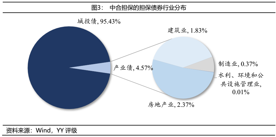 城投債是中合擔保的在保債券中的絕對主力,產業債占比相對較小。截至2021年4月,中合擔保的在保債券中城投債余額為522.88億,占比95.43%,產業債余額為25.04億,占比4.57%。