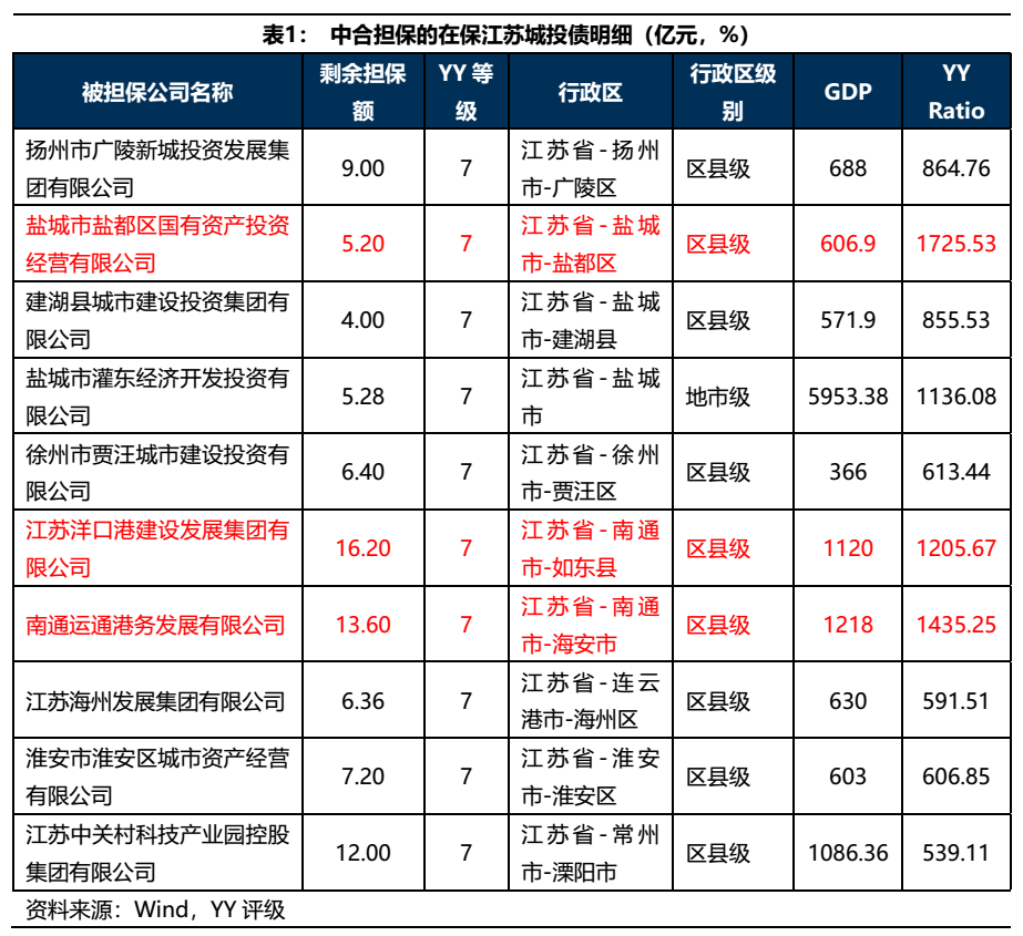 中合在保的江蘇弱資質城投債總計85億元,YY等級均為7,行政區級別以區縣級為主。江蘇的平臺債務壓力一直較大,但好在其經濟發展水平較高,所以市場并不十分擔心其違約,但是鹽都國資、洋口港建發、運通港務等層級較低且所在區域債務壓力較大的平臺仍需重點關注。