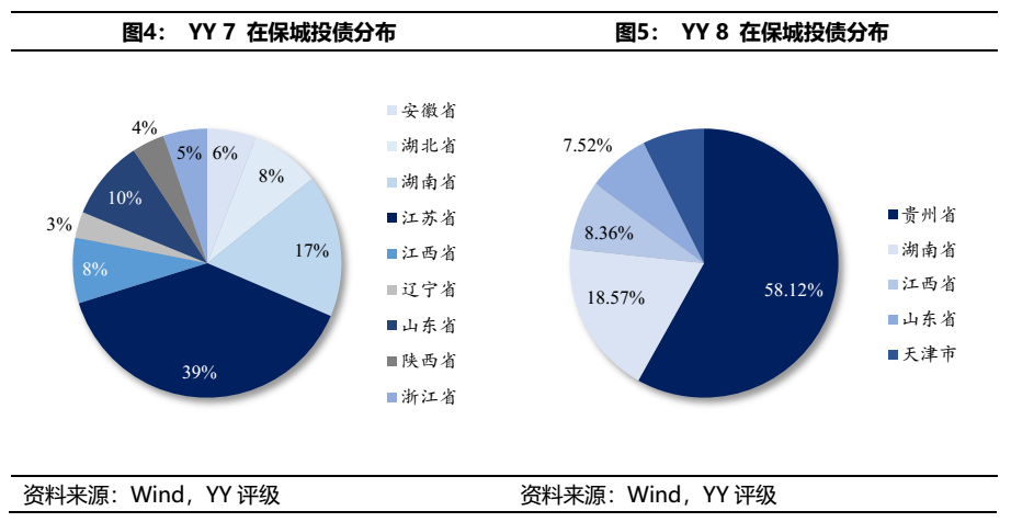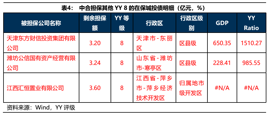 除上述提及的弱資質城投債外,中合在保的其他YY等級達到8的主體還有三個,分別是江西的匯恒置業,濰坊的公信國資和天津的東方財信,剩余擔保額總計8億元。天津和濰坊都是城投的網紅地區,債務壓力較大,涉及到的兩個主體層級也較低,需要重點關注;匯恒置業平臺層級也是較低,且僅是當地的次要平臺,區域重要性不高,也需要持續關注。