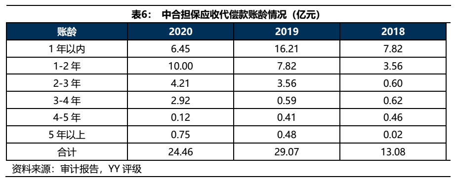 中合擔保2020的代償情況和回收情況均較2019年有所緩解。從應收代償款賬齡來看,假設當年代償款當年未回收,則中合擔保在2020年共發生代償6.45億元,相較于2019年的16.21億下降明顯。從代償款回收情況看,2020年回收了2019年的代償款6.21億元,回收了2018年的代償款3.61億元,而2019年對2018年和2017年的代償款回收均為0,因此代償款回收情況也改善明顯。盡管2020年公司代償情況和回收情況有所緩解,但由于歷史包袱過重,2020年公司的應收代償款減值損失仍然達到5.92億,導致公司盈利表現較差。