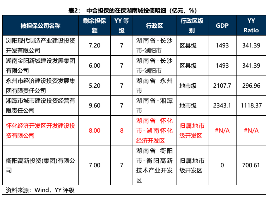 中合在保的湖南弱資質城投債總計43億元,大部分YY等級為7,只有懷化經開建投的YY等級為8。湖南省的經濟實力在全國處于中上游水平,債務壓力尚可,違約風險不高,重點關注評級較低的懷化經開建投。