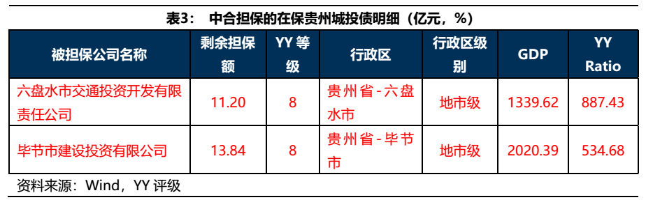 中合在保的貴州弱資質城投債總計25億元,集中在六盤水和畢節兩地,YY等級均為8。作為城投圈里紅得不能再紅的省份,貴州的擔保債自然是重點關注的對象。事實上,中合在貴州擔保的城投債總共就只有這25億,但不出意外資質都令人擔憂。考慮到貴州這兩個主體擔保規模較大,一旦城投債違約的閘門被放開,中合屆時或面臨較大的代償壓力。