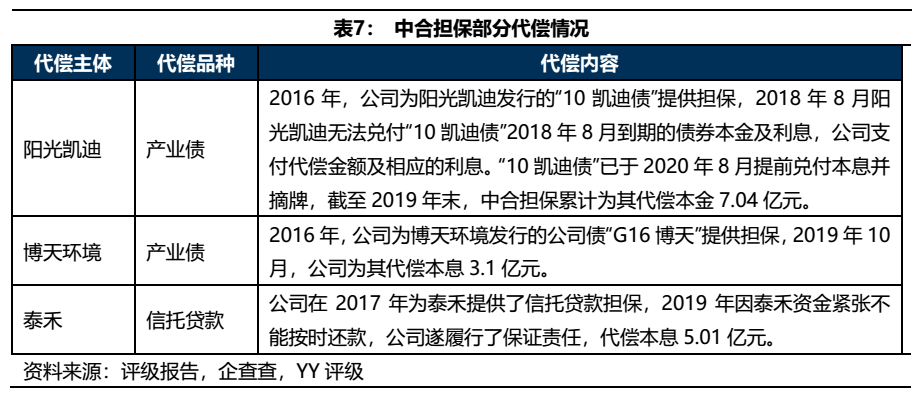 已知的中合擔保代償品種主要涉及產業債、信托計劃、銀行貸款等,目前已知的大規模代償對象有陽光凱迪、博天環境、泰禾等。截至2019年末,中合擔保累計為“10凱迪債”代償本金7.04億元;2019年,公司為“G16博天”代償本息3.1億元,“G16博天”將在今年10月份到期,預計公司還會有相應的代償支出;2019年公司為泰禾的信托貸款代償本息5.01億元,這也是2019年公司單一最大項目代償規模。