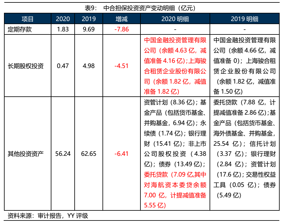 通過將2020年和2019年具體的投資標的規模進行對比,我們發現2020年公司投資資產上的變化主要是:①公司處置了大量的基金、信托、資管計劃投資,可能是受到擔保新規影響;②由于海航集團的破產重組,公司在2020年計提了大量的委托貸款減值準備;③由于中國金融投資管理有限公司(以下簡稱“中金投”)業績大幅虧損,公司在2020年計提了大量的長期股權投資減值準備。