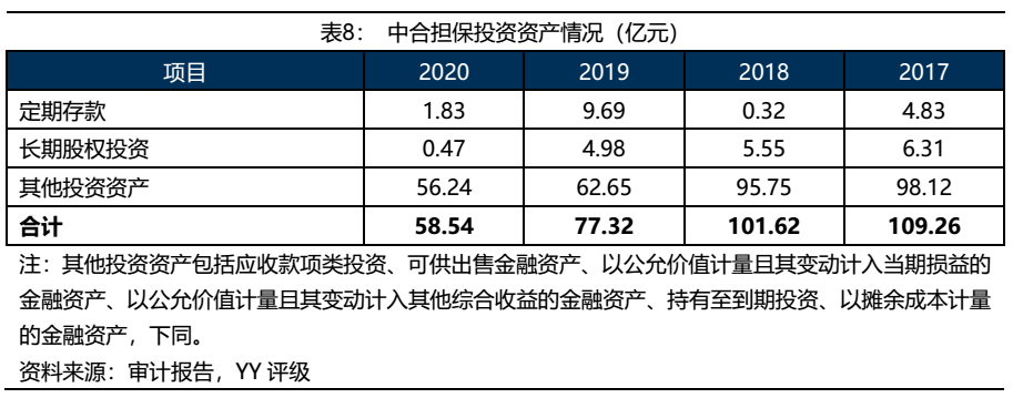 公司近年來投資資產規模不斷下降,總體呈現收縮狀態。隨著融資擔保新規的出臺,擔保公司從事投資業務有了更大的限制。2017-2020年,公司總體處于縮表狀態,2020年公司投資資產規模較上一年大幅下降23.90%。