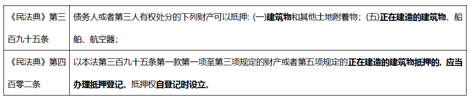 所謂在建工程, 顧名思義, 即為正在建造、尚未辦理所有權首次登記的房屋等建筑物, 且通常情況下都是尚未經過竣工驗收的房屋。根據《民法典》的相關規定, 無論是取得所有權證的房屋還是在建工程均可辦理抵押, 且抵押權均自登記時設立。